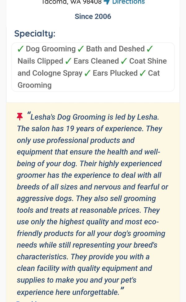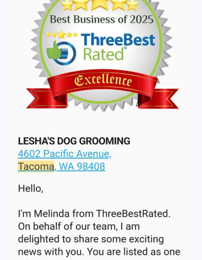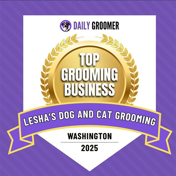 “Lesha’s is fantastic. I moved to Olympia and I drive up to have my dog Pearl groomed by them still because they are SO great with her. She is a rescue and has sensitivity issues and everybody is so kind about it with her. They take their time, treat her with love, and she always looks exactly how I expect every time. I’ve had to cancel, reschedule, miss all last minute and everybody has been so sweet and wonderful about it. The facilities are great – it feels like walking her into a friend’s house to get groomed! – and everything is organized and tidy. It’s very clear to me Lesha takes her career seriously and having someone who’s as gentle with my dog as I would be makes me so much more comfortable leaving Pearl in their extremely capable hands.” ~ Sarah S