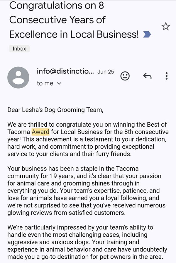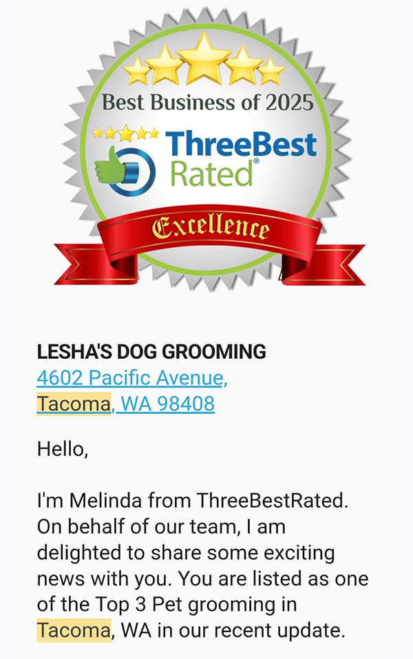 “Wonderful place and great service. Bentley has been going there for years and we still make the trip now that we live in Spanaway. Lesha and her staff have a passion for what they do and it shows.” ~ Demond L